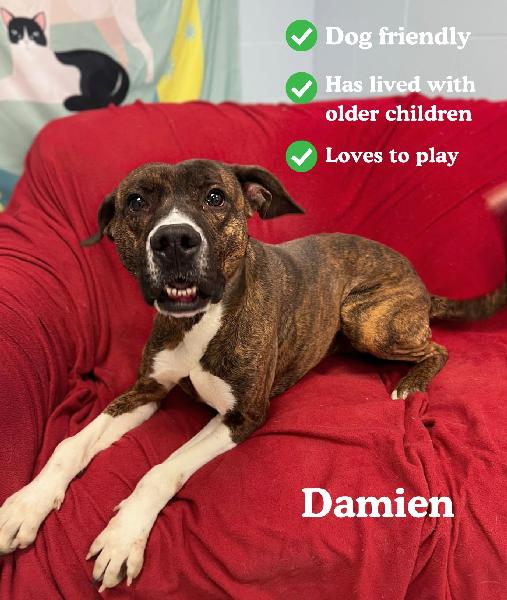 Damien was seized from a home that was condemned even though he had been living in it (along with a child). He was eating trash to survive and was never let out to use the bathroom. He is a total sweetheart and gets excited very easily! He loves to run, but does not stray far from his human. He is dog friendly too.This dog has been available for 23 days